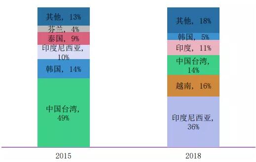 2015&2018年瓦楞紙進口來源地(來源:RISI) 這讓中國的原紙進口市場異常復雜。依靠高緯度針葉林的高質量纖維優勢,歐美國家的全木漿牛卡一直是專供于某些大品牌客戶,在這一類市場占據穩定而有限的市場份額;對標國內一線紙廠的瓦楞紙,根據克重分層,則或來源于俄羅斯,改造新聞紙機生產。或來自東南亞,此外還有用量不大的掛面箱板紙,也是多來自于東南亞,少部分歐洲。澳洲除了出口少量低克重全木漿牛卡外,還大量出口芯紙(施膠)。 然而最值得關注的還是東南亞市場。近年來,中國從東南亞進口的原紙數量越來越大,特別是70-90g的瓦楞紙,一度在部分沿海二級廠呈泛濫之勢。當然,口碑分化也很厲害,這里面的差距大到甚至讓人看顏色聞味道一眼就能區分的程度。 然而不管怎么說,在絕對價格優勢下,仍然還會有部分包裝企業能夠接受。我們可以這樣理解,東南亞的原紙正在某種程度上復制中國紙企曾經走過的路。“摸著中國過河”,憑借價格優勢,來自東南亞新興市場的進口紙異軍突起。 2.轉移:新興市場崛起原因分析 說起東南亞市場,又不得不提到中國臺灣,以及臺灣工業用紙三大廠,正隆、榮成和永豐余,這也是前面一章沒有提到的另一個重要進口紙來源。 自上世紀70年代末我國內地實行對外開放以來,香港和臺灣就一直是內地最主要的外來投資者。在改革開放后相當長的一段時間,港臺投資商給內地帶來資金、技術的同時,也帶來了現代企業的經營理念和管理經驗,伴隨著制造業的轉移,大量制造業產能被搬到了內地。 繁榮的制造業衍生了海量的包裝用紙需求。在21世紀初期,臺灣三大紙廠快馬加鞭、“揮師大陸”,在華東、華北及華中等地區大量投資建廠,一度成為中國包裝造紙領域的重要力量。 然而風水輪流轉,隨著環保壓力、用工成本增大,以及外廢限令等問題的觸發,臺灣的造紙企業開始了轉移之旅,逐漸把大陸當做一個銷售市場。其主要的轉移目的地,除了臺灣本省之外,另一個主要選擇就是東南亞地區了。近年來,臺資背景的造紙企業不斷加大在東南亞的投入,大幅度擴建、新建造紙產能。 這一系列操作估計很多老板都很眼熟,比如說制鞋領域,從2018年第四季度開始,臺灣制鞋三雄寶成、豐泰及鈺齊,不約而同持續加強非大陸地區擴產或營運,然后將大量產能轉移到東南亞,特別是越南、泰國等國家。在紡織服裝、玩具領域,也有大量類似的情形。 3.新戰場:發生在東南亞的中國紙企角逐 近八年亞洲其它國家和地區包裝用紙需求量年復合增長率在3%左右,其中越南、印度增長最快;而在出口量方面,越南、中國臺灣、印尼、印度的出口量增長最快。從這一點看,臺資企業將產能轉移到東南亞的選擇“英明無比”。 但是,看上東南亞的不僅是臺資企業,中國紙企也在東南亞展開了競逐。玖龍越南分公司已經成為玖龍九大造紙基地之一年產能為45萬噸;理文造紙是國內最早在國外投資建廠的企業,2007年就在越南開工建設了第一家工廠。山鷹、太陽紙業、景興等,也都在東南亞有大量投資進行布局。 早在2018年,來自越南的再生箱板紙和瓦楞紙在中國進口來源地中占比就分別達到了10%和16%,隨著更多企業布局越南,這一比例逐年增加。 從這個角度,東南亞國家的制造業(包括造紙)在“摸著中國過河”,但中國的企業又何嘗不是在“借雞生蛋”? 造紙企業選擇東南亞的原因,除了短期內的人工成本優勢外,最根本就是東南亞國家的環保政策優勢了。從2017年國內開始施行廢紙進口限令以來,國內優質造紙原料渠道受限,東南亞地區,特別是越南憑借地理優勢,成為了造紙廠的最佳選擇。通過在越南建廠,就近使用外廢生產原紙,不僅可以緩解國內原料需求壓力,還可以競爭越南本地需求市場。近十年來,越南的包裝用紙需求量年復合增長率持續保持在10%以上,但絕大部分市場,都基本被中國(包括臺灣省)所壟斷。 換句話說,雖然看起來進口紙的數量在不斷增大,但我們能看到的很多進口紙,可能還是中國紙企生產的,只不過地區變了(甚至在某種程度上,它還稀釋了美國、澳大利亞、俄羅斯等國家地區的比例)。 4.新時代:包裝人如何應對可能的市場萎縮 一路深挖下來,我們已經基本知道近年來進口紙市場突變的根源了。然而,討論這些對包裝企業有什么意義呢?回到最開始的兩個話題。 源源不斷的進口紙,讓國內原紙價格走向出現了一定的變數,這種影響到底多大?隨著國外新興市場復制中國模式,讓中國制造業轉移、帶動包裝需求減少,讓中國包括包裝產業的企業出現萎縮危機,中國企業該怎么反思? 據中國造紙協會調查資料,2019 年全國紙及紙板生產企業約2700 家,全國紙及紙板生產量 10765 萬噸,較上年增長 3.16%。2019年紙及紙板進口625萬噸,較上年增長 0.48%。換算下來,進口紙所占的比例為5.8%,不足6%。 從這個比例來看,進口紙在一定程度上會成為原紙價格的影響因素,但不會成為主導因素。為了打壓進口紙采取某種大降價,這是丟了西瓜撿芝麻——我們或許可能在某一地區或者某一特殊時期聽說這種“神奇操作”,但絕不會成為主流。 但另外一個話題,東南亞新興制造業的崛起,對中國制造業的借鑒意義,明顯更值得思考。以前是“中國買什么,什么貴;賣什么,什么便宜”。而現在,不管是造紙還是服裝,制鞋業,這些中國制造傳統項目優勢的丟失,對中國制造業信心層面的