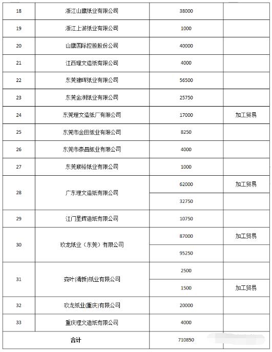 9月18日,中國環保與固廢化學品管理網公布了今年第12批限制進口類產品明細,共有33家紙廠獲批,總核定量為71.085萬噸。其中,玖龍、山鷹和理文三家紙業巨頭共獲核定量53.9萬噸,占總量的75.82%。