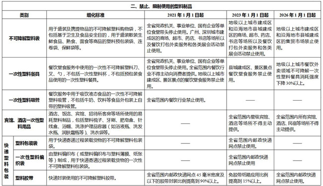 (注:1.該目錄涉及塑料制品類別的細化標準將根據實際執行情況進行動態更新調整。2.在應對自然災害、事故災害、公共衛生事件和社會安全事件等重大突發公共事件期間,用于特定區域應急保障、物資配送、餐飲服務等的一次性塑料制品免于禁限使用。)分時間節點、區域范圍
