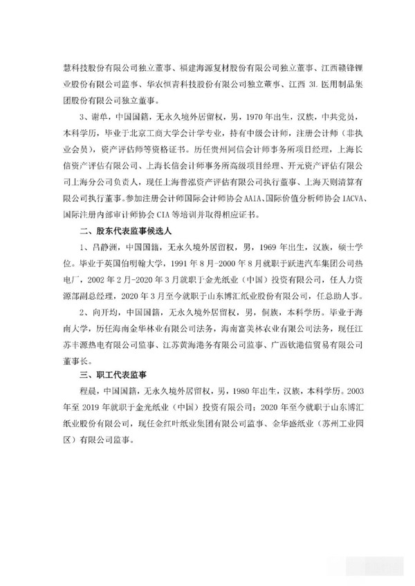 鑒于山東博匯紙業(yè)股份有限公司(以下簡稱“公司”)間接控股股東已變更為金光紙業(yè)(中國)投資有限公司(以下簡稱“金光紙業(yè)”),公司董事會(huì)、監(jiān)事會(huì)擬提前進(jìn)行換屆。