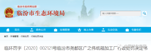 近日,筆者從山西省臨汾市生態環境局官網獲悉,臨汾市堯都區廣之偉紙箱加工廠因未依法備案建設項目環境影響評價文件,被環保部門罰款2萬元。