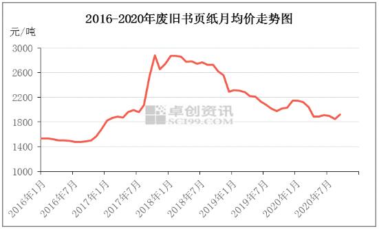 據卓創資訊監測數據顯示,2020年國廢書頁紙均價為1963元/噸,同比下跌8.48%。其中,全年月均價最高值出現在1月份,為2146元/噸;最低值出現在8月份,為1850元/噸。