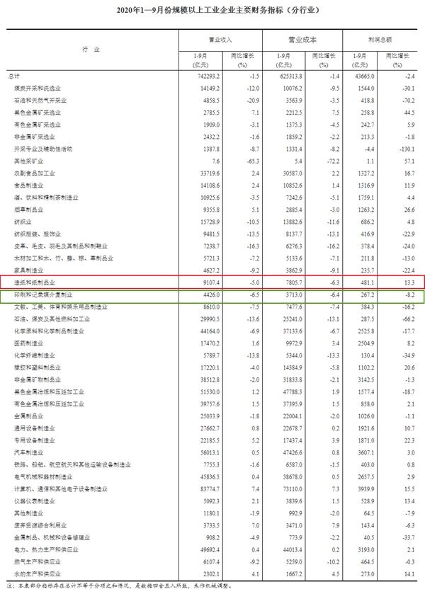 21個行業利潤總額同比增加 在41個工業大類行業中,21個行業利潤總額同比增加,20個行業減少。其中,造紙和紙制品業實現營業收入9107.4億元,同比下滑5%;利潤總額481.1億元,同比增長13.3%。印刷和記錄媒介復制業實現營業收入4426.0億元,同比下滑6.5%;利潤總額267.2億元,同比下降8.2%。 而其余主要行業利潤情況如下: 專用設備制造業增長22.3%; 農副食品加工業增長16.7%; 計算機、通信和其他電子設備制造業增長15.5%; 通用設備制造業增長10.7%; 紡織業增長4.8%; 汽車制造業增長3.0%; 電氣機械和器材制造業增長2.9%; 有色金屬冶煉和壓延加工業增長2.1%; 電力、熱力生產和供應業增長2.1%; 石油和天然氣開采業下降70.2%; 石油、煤炭及其他燃料加工業下降66.2%; 煤炭開采和洗選業下降30.1%; 黑色金屬冶煉和壓延加工業下降18.7%; 化學原料和化學制品制造業下降17.7%; 非金屬礦物制品業下降1.3%。