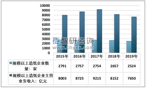 紙杯由紙杯原紙和塑料樹脂粒子擠出復合而成,塑料樹脂一般使用PE樹脂。紙杯原紙的主要成分是植物纖維,其制作過程一般是用針葉木、闊葉木等植物纖維制成漿經散漿、磨漿、加入化工輔料、篩選后,用紙機抄造。 據國家統計局統計的2524家造紙生產企業,2019年1-12月主營業務收入7650億元;受利潤總額下降的影響,國內規模以上造紙企業數量近些年處于下降趨勢。在統計的2524家造紙生產企業中,虧損企業有560家,占22.19%。 2015-2019年中國規模以上造紙企業數量及主營業務收入情況