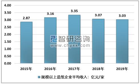 資料來源:國家統計局、智研咨詢整理 2017年,中國規模以上造紙企業主營業務平均收入達到峰值的3.35億元/家,隨后兩年開始不同程度的下降,截至2019年,國內規模以上造紙企業主營業務平均收入下降至3.03億元/家。 2015-2019年中國規模以上造紙企業平均收入走勢