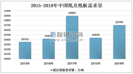 資料來源:中國造紙協會、智研咨詢整理 2015-2019年中國紙及紙板需求量情況
