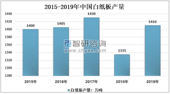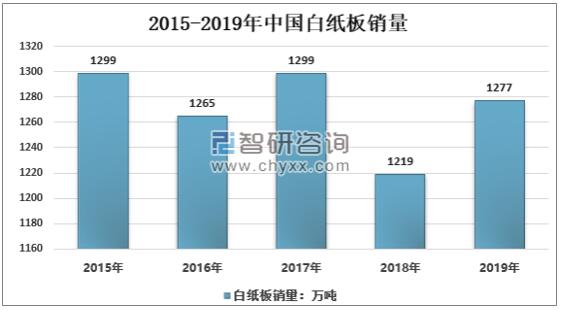 資料來源:中國造紙協會、智研咨詢整理 紙杯制造主要用白紙板為主,2019年中國白紙板產量1410萬噸,相比2018年有所回升,2019年中國白紙板銷量1277萬噸,同比增長4.76%。 2015-2019年中國白紙板行業產量情況
