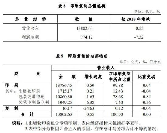 11月3日,國家新聞出版署發布《2019 年全國新聞出版業基本情況》。 2019 年,全國共出版圖書、期刊、報紙、音像制品和電子出版物 450.70 億冊(份、盒、張),較 2018 年降低 3.13%。其中,出版圖書 105.97 億冊(張),增長 5.87%,占全部數量的 23.51%;期刊21.89 億冊,降低 4.48%,占 4.86%;報紙 317.59 億份,降低 5.83%,占 70.47%;音像制品 2.32 億盒(張),降低 3.95%,占 0.51%;電子出版物 2.93 億張,增長 13.05%,占 0.65%。全國出版圖書、期刊、報紙總印張為 1855.82 億印張,與上年相比,降低 4.20%。 -圖書- 截至 2019 年年底,全國共有出版社 585 家①(包括副牌社 24 家),其中中央級出版社 218 家(包括副牌社 13 家),地方出版社 367 家(包括副牌社 11 家)。 2019 年,全國出版新版圖書 224762 種,總印數 24.97 億冊(張),總印張 258.91 億印張,定價總金額 841.20 億元;與上年相比,品種降低 9.04%,總印數降低 0.79%,總印張降低 0.22%,定價總金額增長 1.70%。重印圖書 281217 種,總印數 61.96 億冊(張),總印張541.52 億印張,定價總金額 1191.77 億元;與上年相比,品種增長3.33%,總印數增長 7.31%,總印張增長 8.58%,定價總金額增長14.18%。租型圖書總印數 19.04 億冊(張),總印張 137.61 億印張,定價總金額 145.99 億元;與上年相比,總印數增長 10.80%,總印張增長 10.69%,定價總金額增長 10.59%。 -期刊- 2019 年,全國共出版期刊 10171 種,平均期印數 11957 萬冊,每種平均期印數 1.21 萬冊,總印數 21.89 億冊,總印張 121.27 億印張,定價總金額 219.83 億元。與上年相比,種數增長 0.32%,平均期印數降低 3.03%,每種平均期印數降低 3.34%,總印數降低 4.48%,總印張降低 4.32%,定價總金額增長 0.88%。 -報紙- 2019 年,全國共出版報紙 1851 種,平均期印數 17303.34 萬份,每種平均期印數 9.35 萬份,總印數 317.59 億份,總印張 796.51 億印張,定價總金額 392.39 億元。與上年相比,種數降低 1.07%,平均期印數降低 1.60%,總印數降低 5.83%,總印張降低 14.16%,定價總金額降低 0.27%。 -音像制品與電子出版物- 截至 2019 年年底,全國共有音像制品出版單位 386 家,電子出版物出版單位 317 家。2019 年,全國共出版錄音制品 6571 種、16931.93 萬盒(張)。與上年相比,品種增長 2.82%,數量降低 4.64%。 -印刷復制- 2019 年,印刷復制(包括出版物印刷、包裝裝潢印刷、其他印刷品印刷、專項印刷、印刷物資供銷和復制)實現營業收入 13802.63億元,與上年相比,增長 0.55%;利潤總額 774.12 億元,降低 7.32%。出版物印刷(含專項印刷)營業收入1715.17 億元,增長0.21%;利潤總額 103.04 億元,降低 6.43%。包裝裝潢印刷營業收入10860.30億元,增長 1.63%;利潤總額 599.74 億元,降低5.86%。其他印刷品營業收入1049.25 億元,降低 6.38%;利潤總額 70.64 億元,降低19.68%。