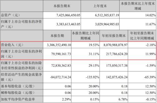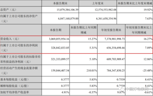 裕同科技 今年第三季度,裕同科技實現營收30.69億元,同比增長15.27%;實現歸屬于上市公司股東的凈利潤3.29億元,同比增長5.31%。 而今年前三季度,裕同科技實現營收73.79億元,同比增長16.27%;實現歸屬于上市公司股東的凈利潤6.56億元,同比增長7.89%。