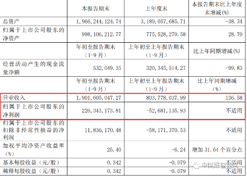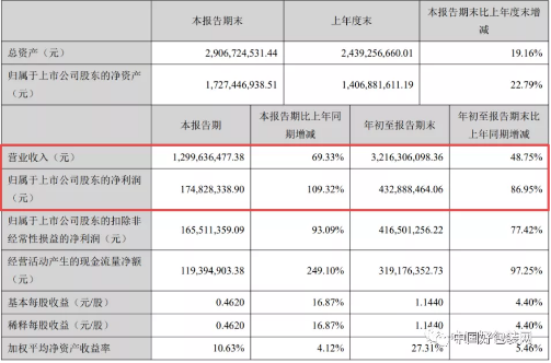 吉宏股份 今年第三季度,吉宏股份實現營收13.00億元,同比增長69.33%;實現歸屬于上市公司股東的凈利潤1.74億元,同比增長109.32%。 而今年前三季度,吉宏股份實現營收32.16億元,同比增長48.75%;實現歸屬于上市公司股東的凈利潤4.33億元,同比增長86.95%。