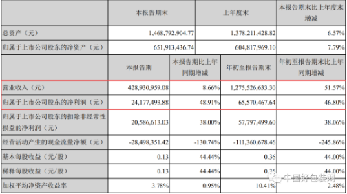 環球印務 今年第三季度,環球印務實現營業收入4.29億元,同比增長8.66%;實現歸屬于上市公司股東的凈利潤為2417.75萬元,同比增長48.91%。 而整個前三季度,環球因為營收達12.76億元,同比增長51.57%;歸屬于上市公司股東的凈利潤為6557.05萬元,同比增長46.80%。