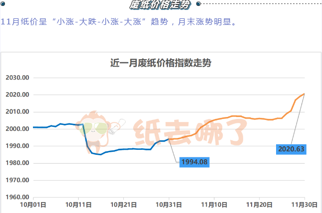 導語:12月2日全國國廢黃板紙市場小幅探漲,北方地區補漲為主,太康龍源上調30,山東地區濰坊匯勝、世紀陽光都有上漲。南方福建地區龍頭紙企華南山鷹、聯盛、三星上調30-50,廣東以及江浙地區零星調整。國廢市場幾日來皆以小幅上漲為主,各紙廠觀望氣氛濃厚。后期走勢多以平穩向好發展,建議各商家進出貨保持隨進隨出。 11月廢紙月報  截至11月30日上午,廢紙價格指數為2020.63,相比10月31日的1994.08,上漲了26.55點。 廢紙的回漲基本回應了兩方面的市場期待: 1)外廢全面“清零”國內造紙廠將在廢紙端爭奪越加激烈,行業集中度恐進一步提高! 2)用廢紙的全面回漲支撐原紙的價格遏制可能的下降趨勢。 11月25日,生態環境部、商務部、國家發展和改革委員會、海關總署發布《關于全面禁止進口固體廢物有關事項的公告》(下稱《公告》)稱,禁止以任何方式進口固體廢物,禁止我國境外的固體廢物進境傾倒、堆放、處置。公告自2021年1月1日起施行。 隨后的11月27日,該條消息已迅速攀上微博熱搜榜,引發網友熱議。