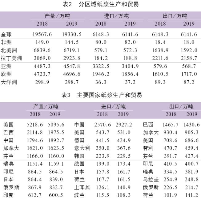 在全球經(jīng)濟(jì)繼續(xù)下行和貿(mào)易緊張局勢加劇的背景下,2019年全球紙業(yè)出現(xiàn)少見的主要生產(chǎn)和貿(mào)易指標(biāo)全面下降的態(tài)勢,紙漿產(chǎn)量結(jié)束了連續(xù)五年增長勢頭,廢紙回收以及紙和紙板產(chǎn)量連續(xù)第二年下降,廢紙貿(mào)易連續(xù)三年下降,紙和紙板貿(mào)易近四年來首次下降,紙漿貿(mào)易近十年首次下降,全球紙業(yè)可持續(xù)發(fā)展面臨巨大挑戰(zhàn)。 2019年全球經(jīng)濟(jì)繼續(xù)下行,GDP增長2.5%,增幅比2019年收窄0.6個百分點(diǎn),在單邊主義和保護(hù)主義抬頭、貿(mào)易摩擦升級、英國脫歐及諸多不利因素影響下,全球貿(mào)易額下降3%。在上述宏觀經(jīng)濟(jì)背景下,2019年全球紙漿產(chǎn)量下降1.2%,結(jié)束了連續(xù)五年的增長勢頭;廢紙回收量下降0.5%,紙和紙板產(chǎn)量下降1%,均系連續(xù)第二年下降。全球紙業(yè)貿(mào)易額全面下滑,其中紙和紙板出口量下降2.5%,是近四年來首次下降;紙漿出口量下降0.1%,系近十年首次下降;廢紙出口量下降10.5%,系連續(xù)三年下降,下降幅度明顯超過前兩年?傮w看,2019年全球紙業(yè)的生產(chǎn)和貿(mào)易各項(xiàng)主要指標(biāo)均呈現(xiàn)下降態(tài)勢,這是近幾十年來未有的疲軟局面,全球紙業(yè)的可持續(xù)發(fā)展面臨巨大挑戰(zhàn)。 1 紙漿 1.1 紙漿生產(chǎn) 2019年全球紙漿產(chǎn)量為19330.5萬噸,比2018年下降1.2%。其中,亞洲紙漿產(chǎn)量為4547.8萬噸,增長1.4%,是各大洲中唯一的正增長區(qū)域;拉丁美洲2923.8萬噸,下降4.7%,是下降幅度最大的區(qū)域;北美洲6719.1萬噸,歐洲4696.6萬噸,大洋洲298.7萬噸,非洲144.5萬噸,均比2018年有所下滑。紙漿產(chǎn)量最大的五個國家是美國(5095.6萬噸)、巴西(1975.5萬噸)、中國(1892.7萬噸)、加拿大(1623.5萬噸)和芬蘭(1160萬噸),其他產(chǎn)量較大的國家有瑞典、印尼、日本、俄羅斯、印度,上述10個國家的合計(jì)產(chǎn)量下降1.4%。
