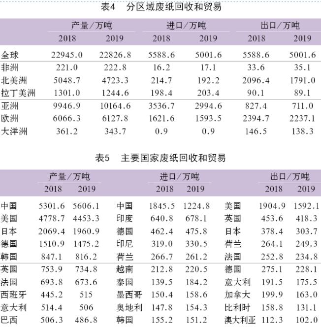 2 廢紙回收 2.1 廢紙回收量 2019年全球廢紙回收量為22826.8萬噸,比2018年下降0.5%。其中,亞洲、歐洲和非洲的廢紙回收有所增長。亞洲廢紙回收量10164.6萬噸,增長2.%;歐洲6127.8萬噸,增長1%;非洲222.8萬噸,增長0.8%。廢紙回收量下滑主要來自北美洲和拉丁美洲,其中北美洲回收量4723.3萬噸,下降6.4%;拉丁美洲1244.6萬噸,下降4.3%;大洋洲343.7萬噸,下降4.8%。廢紙回收量最大的五個國家是中國(5606.1萬噸)、美國(4453.3萬噸)、日本(1960.9萬噸)、德國(1475.2萬噸)、韓國(816.2萬噸),其他廢紙回收量較大的國家有英國、法國、西班牙、意大利、巴西,上述10個國家的合計(jì)回收量下降1.1%。 2.2 廢紙貿(mào)易 2019年全球廢紙出口貿(mào)易量為5001.6萬噸,比2018年下降10.5%。其中,非洲、北美、歐洲和大洋洲是廢紙凈出口地區(qū),非洲凈出口量18萬噸,北美洲1598.8萬噸,歐洲為643.7萬噸,大洋洲為137.4萬噸。拉丁美洲和亞洲是廢紙凈進(jìn)口地區(qū),其中,亞洲凈進(jìn)口量2283.7萬噸,拉丁美洲114.3萬噸。廢紙進(jìn)口量最大的五個國家是中國(1224.8萬噸)、印度(678.1萬噸)、德國(475.8萬噸)、印尼(330.5萬噸)、荷蘭(261.2萬噸),其他進(jìn)口量較大的國家有越南、泰國、墨西哥、奧地利、韓國,上述10個國家的合計(jì)進(jìn)口量下降11.5%。廢紙出口量最大的五個國家是美國(1592.1萬噸)、英國(418.3萬噸)、日本(303.7萬噸)、荷蘭(249.3萬噸)、法國(234.8萬噸),其他出口量較大的國家有德國、意大利、加拿大、比利時、澳大利亞,上述10個國家的合計(jì)出口量下降14.2%。