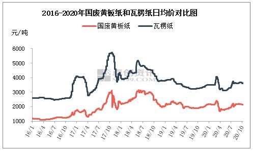2016-2020年廢舊黃板紙價格與瓦楞紙走勢基本一致,呈現(xiàn)先低位維穩(wěn)后震蕩沖高再回落盤整態(tài)勢。2016年1-10月份廢舊黃板紙與瓦楞紙價格變動幅度不大,近五年來價格最低點均出現(xiàn)在此期間。而隨著國家“十三五規(guī)劃”政策的推行實施、環(huán)境治理力度的加強以及新固廢法政策的發(fā)布落實,瓦楞紙市場供應端收縮明顯,在原料廢舊黃板紙價格上漲及下游需求穩(wěn)步提升的情況下,2017年價格推漲至高位。然自2018年開始瓦楞紙市場逐漸回歸理性,影響價格變動因素由供需面轉(zhuǎn)為市場化,原料廢舊黃板紙價格對瓦楞紙價格走勢影響趨于減弱。2019年市場區(qū)域理性盤整階段,整體行情運行相對穩(wěn)定。2020年受全球公共衛(wèi)生事件的影響,廢紙與瓦楞紙價格變動頻繁,兩者階段性出現(xiàn)走勢背離現(xiàn)象。據(jù)卓創(chuàng)統(tǒng)計數(shù)據(jù)顯示,2016年8月廢舊黃板紙與瓦楞紙價差最小,兩者價差僅在1250元/噸,2017年10月兩者價差達到了2924元/噸,高低價差的差幅在133.92%。2020年價差高值出現(xiàn)在3月,差值在1621元/噸,低值出現(xiàn)在5月,差值在1314元/噸,高低價差的差幅在23.36%