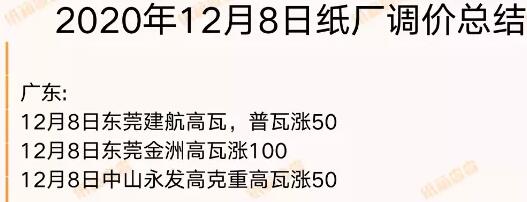 導語:12月才過去10天,東莞四小龍原紙已經漲了3次,如此頻繁連漲,背后是陰謀?還是信心使然? 1、12月僅過10天,東莞四小龍原紙已經漲了3次 據“紙箱查查”消息:12月8日起,廣東部分紙廠原紙價格上調50-100元/噸,市場漲聲不斷,預計這波漲價潮面積將進一步擴大。