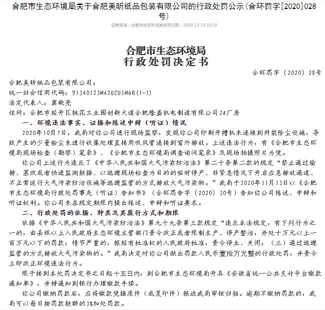 導(dǎo)語:12月14日,安徽省合肥市生態(tài)環(huán)境局發(fā)布一則關(guān)于合肥美昕紙品包裝有限公司的行政處罰公示:2020年10月7日,我局對你公司進行現(xiàn)場監(jiān)察,發(fā)現(xiàn)你公司印刷開槽機未連接到網(wǎng)袋除塵設(shè)施,導(dǎo)致產(chǎn)生的少量粉塵未進行收集處理直接用吸風(fēng)管連接到窗外排放。