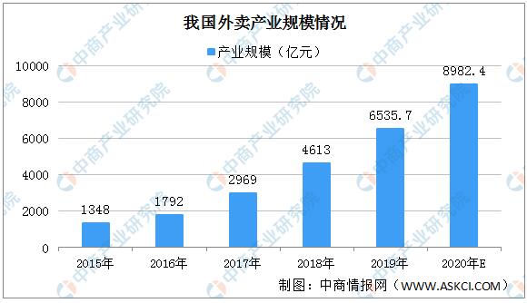 ▲數(shù)據(jù)來源:CNNIC、中商產(chǎn)業(yè)研究院整理 在我國龐大網(wǎng)民基礎(chǔ)的上,外賣行業(yè)得到快速的發(fā)展。數(shù)據(jù)顯示,2018年我國外賣交易額4613億元,2019年外賣規(guī)模預(yù)計(jì)將達(dá)6535.7億元。2020年上半年疫情防控需要,餐飲店堂食受到影響,多開展外賣服務(wù)。另一方面,外賣滲透率高,疫情致使生活超市、生鮮果蔬、醫(yī)療健康等非餐品訂單占比的日益提升,預(yù)計(jì)2020年外賣產(chǎn)業(yè)規(guī)模將逼近9000億元。