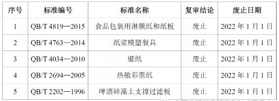 工業和信息化部2020年12月31日發布公告(中華人民共和國工業和信息化部公告2020年第51號),公告了一批行業標準的復審結論。其中,QB/T 4819—2015《食品包裝用淋膜紙和紙板》等五項造紙行業標準予以廢止,廢止日期均為2022年1月1日。具體情況如下: