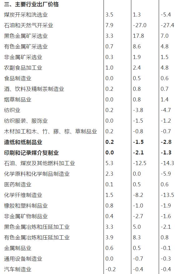 1、工業(yè)生產(chǎn)者價格同比變動情況 工業(yè)生產(chǎn)者出廠價格中,生產(chǎn)資料價格下降0.5%,降幅比上月收窄1.3個百分點,影響工業(yè)生產(chǎn)者出廠價格總水平下降約0.33個百分點。 其中,采掘工業(yè)價格下降0.4%,原材料工業(yè)價格下降1.6%,加工工業(yè)價格持平。生活資料價格下降0.4%,降幅比上月收窄0.4個百分點,影響工業(yè)生產(chǎn)者出廠價格總水平下降約0.11個百分點。其中,食品價格上漲0.9%,衣著和耐用消費品價格均下降1.8%,一般日用品價格下降0.4%。