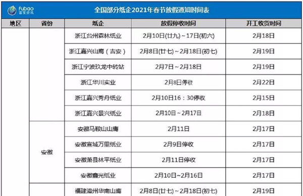 春節已經進入倒計時!今天,小編為大家帶來一份全國部分紙企2021年春節放假通知時間表。這樣,大家就能清楚地知道各大規模紙廠的春節放假停收時間、節后開工收貨時間,以便進行合理規劃!
