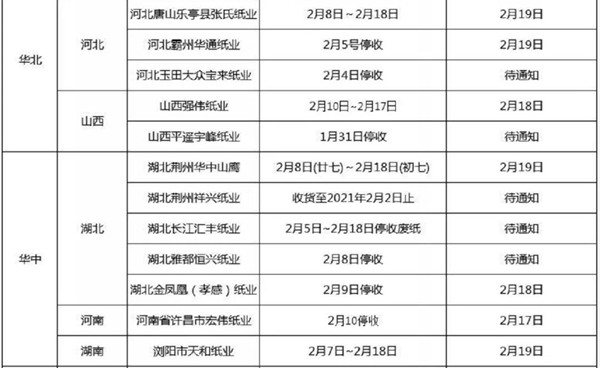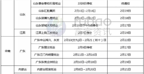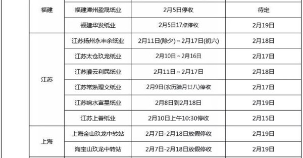 玖龍、理文等48家紙企春節停收及節后開工時間表