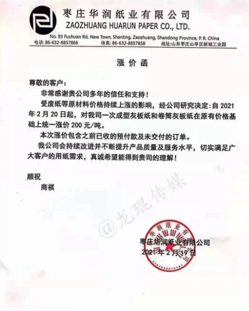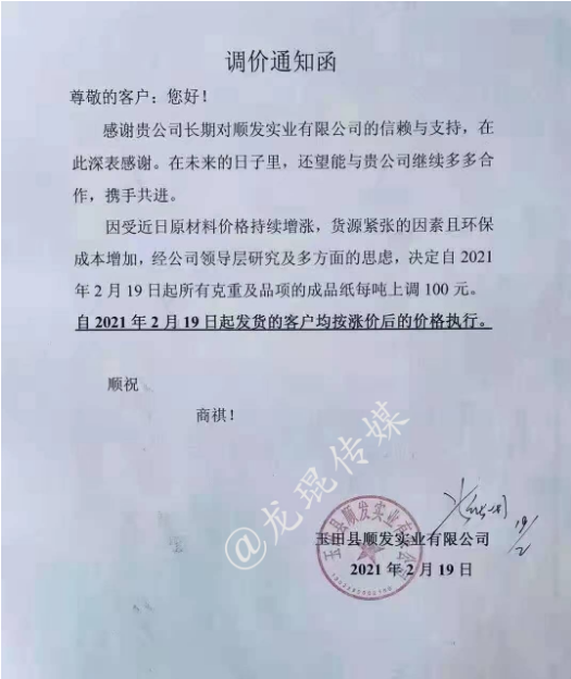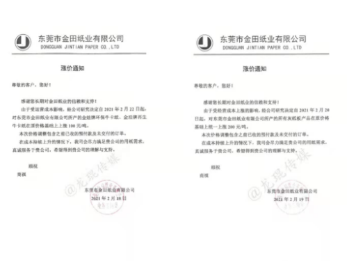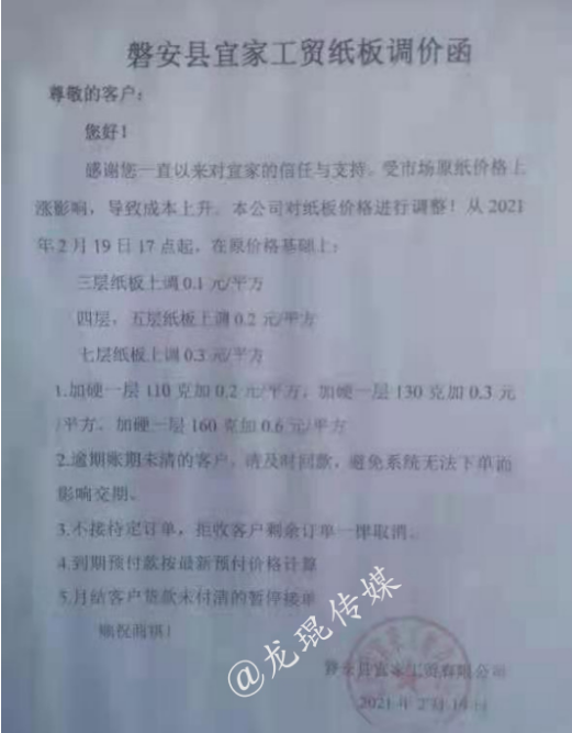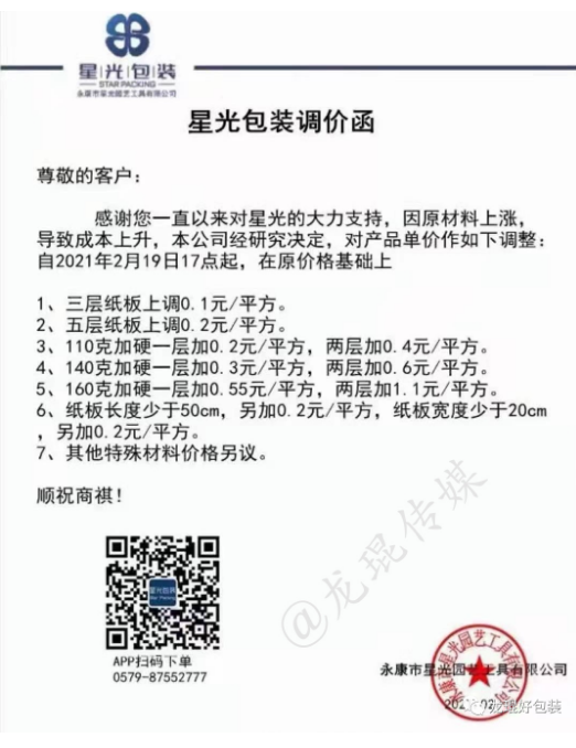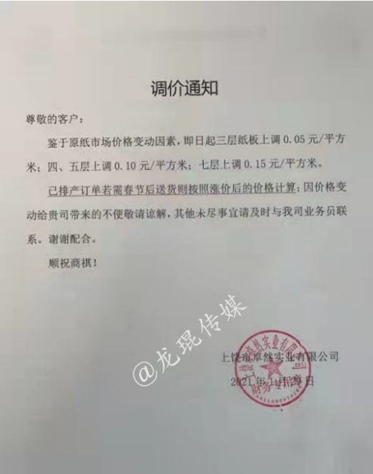 2月18日,正值業內各大企業開工之際,新的一批原紙、紙板漲價函就已襲來。2月19日,漲價范圍逐步擴大,各地中小型紙企紛紛跟漲,紙板、紙箱價格水漲船高。顯然,2021年春節后的第一輪漲價潮,已初具規模。 各地中小跟漲50-200元/噸 在國內三大包裝紙龍頭中,玖龍紙業計劃2月22日上調紙價,山鷹紙業已于2月18日宣布漲價,理文造紙則在2月19日開始調價:江西理文H紙價格上調200元/噸,B/Q紙價格上調100元/噸;江蘇理文箱板紙價格上調100元/噸。 其他大型紙廠也傳出漲價消息,如福建聯盛紙業,牛卡紙漲價100-200元/噸,瓦楞紙漲價100元/噸;浙江景興紙業,瓦楞紙、牛卡紙上調100元/噸;湖北金鳳凰紙業,瓦楞紙上漲100元/噸;山東世紀陽光紙業,白面牛卡紙漲價300元/噸,瓦楞紙上漲100元/噸…… 同時,各地的中小型紙廠也紛紛發布漲價函,東莞金田紙業、中冶銀河紙業、玉田縣順發實業、棗莊華潤紙業等紙企跟漲50-200元/噸,涉及瓦楞紙、牛卡紙、灰紙板等紙種。據筆者統計,目前這輪漲價函已涵蓋浙江、廣東、福建、湖北、河北、山東、江西、江蘇等省份。 東莞市金田紙業有限公司 從2021年2月20日起,所有灰紙板產品在原價格基礎上統一上漲200元/噸,金娃牌環保牛卡紙、金泊牌再生牛卡紙在原價格基礎上上漲100元/噸。  中冶銀河紙業有限公司 從2月19日起,高強瓦楞原紙產品價格在原價格基礎上統一上漲50元/噸。  玉田縣順發實業有限公司 從2021年2月19日起,所有克重及品項的成品紙上漲100元/噸。  棗莊華潤紙業有限公司 從2021年2月20日起,一次成型灰紙板和卷筒灰板紙在原有價格基礎上統一漲價200元/噸。  紙板漲價范圍逐步擴大 2月18日,在原紙價格持續拉升的狀態下,福建福州、浙江寧波、浙江臺州等城市的紙板廠首先打響了年后的第一輪上漲。2月19日,紙板漲價范圍逐步擴大,江西上饒、廣東揭陽、浙江金華等城市也迎來了新的紙板漲價函。 上饒市卓然實業有限公司 即日起,三層紙板上調0.05元/平方,四、五層上調0.1元/平方米,七層上漲0.15元/平方米。  磐安市宜家工貿有限公司 自2月19日17點開始,三層紙板上漲0.1元/平方,四層、五層上漲0.2元/平方,七層上漲0.3元/平方。加硬一層110克加0.2元/平方,加硬一層130克加0.3元/平方,加硬一層160克加0.6元/平方。  永康市星光包裝 從2月19日17點開始,三層紙板上調0.1元/平方,五層上漲0.2元/平方;110克加硬一層加0.2元/平方,兩層加0.4元/平方;140克加硬一層加0.3元/平方,兩層加0.6元/平方;160克加硬一層加0.55元/平方,兩層加1.1元/平方;紙板長度少于50厘米,另加0.2元/平方;紙板寬度少于20厘米,另加0.2元/平方。  成豐紙業 從2021年2月21日18點開始,價格上調。  盡管年前大家對年后的紙價形勢已有心理準備,但原紙漲價潮真正到來的這一刻,還是會有所驚訝。尤其是對處于紙品包裝產業鏈最下游的紙箱廠而言,成本不斷上漲,有時根本來不及與客戶協商調價,最終只能由自身承擔一部分風險。 此外,還有一個現象需要注意,當前除了原紙之外,各種大宗原料基本上都保持上漲勢頭,這是否意味著,紙價上漲并非是單純的行業現象,而是宏觀環境下的小小縮影?