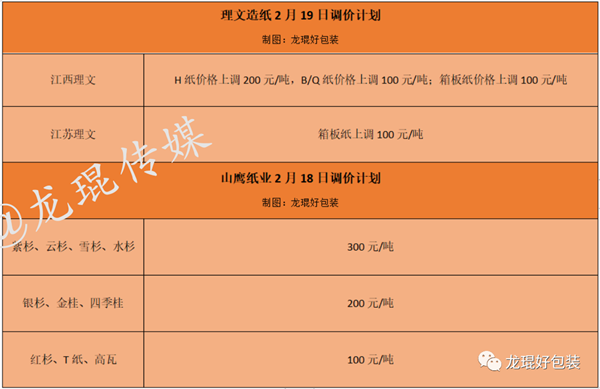 三大包裝紙龍頭漲幅均已確定 至此,國內三大包裝紙龍頭企業均已確定。我們再次回顧下這三家紙企的漲幅,可以看到,臨時生變的玖龍紙業,以及分別于2月18日、2月19日宣布漲價的山鷹國際和理文造紙,最低漲幅為100元/噸,最高則達350元/噸。
