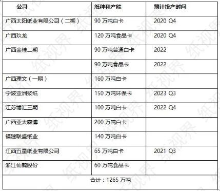 表為已宣布的2025年底前投產白卡紙產能 筆者統計了我國白卡紙未來五年新增產能情況,從列表中公布的新增產能數據來看,未來白卡紙產能釋放仍以龍頭企業擴產為主,已公布的10家企業,共1265萬噸,其中APP金光集團有430萬噸,占全部產能的34%。其中玖龍集團、福建聯盛和仙鶴股份是首次介入白卡紙領域。新增產能主要集中在廣西、浙江、江蘇等地,按照計劃,廣西地區將有810萬噸新增產能,占總產能64%,未來,廣西基地無疑將成為國內最大的白卡紙生產基地。隨著廣西地區諸多利好因素,未來不排除還會有其它造紙企業會選擇在此新上項目,我們拭目以待。