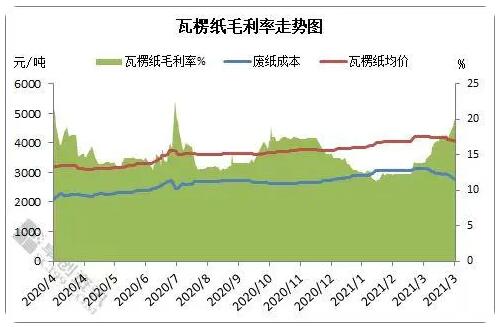 在需求端強勢帶動下,工業包裝紙廠商不僅能通過提價消化原料上漲壓力,整體毛利也有所增加。卓創資訊數據顯示,今年以來工業包裝紙主要品類之一的瓦楞紙毛利率進入上升通道,一季度毛利增幅達到8%左右。