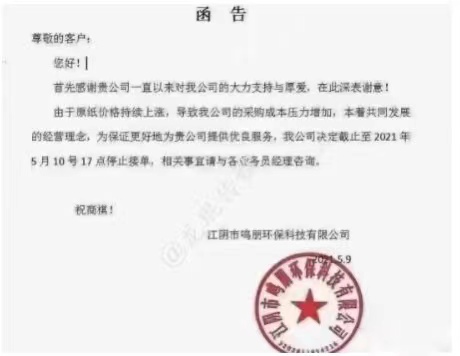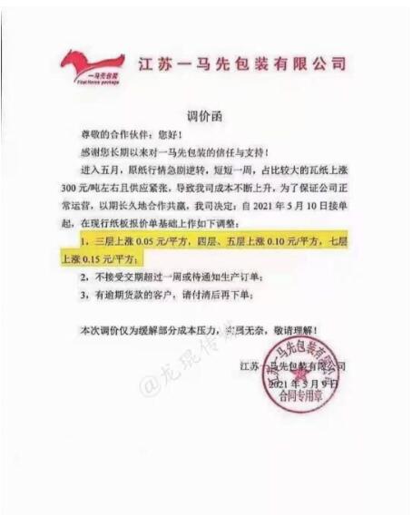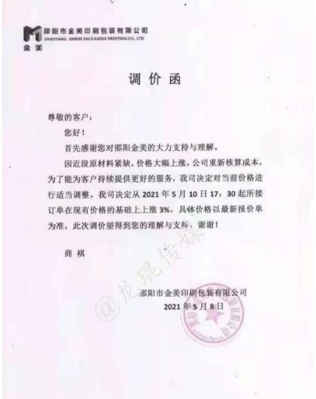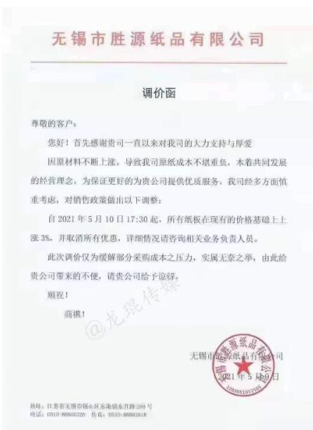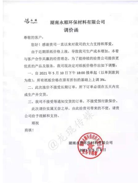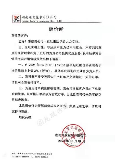 根據(jù)最新消息,5月10日,玖龍紙業(yè)東莞、太倉、天津等基地的部分高瓦、箱板紙價(jià)格將上漲50元/噸。至此,玖龍紙業(yè)5月份的原紙價(jià)格已歷經(jīng)三次變動(dòng),從啟動(dòng)優(yōu)惠調(diào)價(jià)措施到取消優(yōu)惠,再到部分基地調(diào)漲50元/噸,僅用了短短十天時(shí)間。 二季度并非紙品包裝產(chǎn)業(yè)鏈的旺季,但因4月份相關(guān)紙企降價(jià)出貨,包裝紙價(jià)持續(xù)下滑,加之國廢價(jià)格開始上調(diào),導(dǎo)致5月份紙業(yè)市場止跌回漲。此前,華東、華南、華北地區(qū)均有紙廠宣布漲價(jià),漲幅普遍為50-100元/噸。 由于原紙采購成本增加,下游紙板廠紛紛轉(zhuǎn)嫁價(jià)格壓力。5月3日-5月7日,局部地區(qū)紙板價(jià)格上漲,漲幅為2%-5%;5月8日-5月10日,因玖龍漲價(jià)消息提前發(fā)出,湖南、湖北、江蘇、安徽等地區(qū)又有多家紙板廠漲價(jià)3%。 部分最新紙板漲價(jià)函 無錫市勝源紙品有限公司 從2021年5月10日17點(diǎn)30起,所有紙板在現(xiàn)有價(jià)格基礎(chǔ)上上漲3%。  江陰市鳴朋環(huán)?萍加邢薰 從2021年5月10日17點(diǎn)停止接單。  江蘇一馬先包裝有限公司 從5月10日接單起,三層上漲0.05元/平方,四層、五層上漲0.10元/平方,七層上漲0.15元/平方。  邵陽市金美印刷包裝有限公司 從2021年5月10日17點(diǎn)半開始,所接訂單在現(xiàn)有價(jià)格基礎(chǔ)上上漲3%。  岳陽市青方環(huán)保科技有限公司 從2021年5月10日8點(diǎn)開始,決定在現(xiàn)有合作價(jià)格的基礎(chǔ)上上漲3%。  湖南永順環(huán)保材料有限公司 從2021年5月10日18點(diǎn)接單起,所有紙板價(jià)格在原有折扣基礎(chǔ)上上漲3%。  安徽意達(dá)包裝有限公司 從2021年5月9日17點(diǎn)半接單起,按新的價(jià)格核算,之前報(bào)價(jià)及優(yōu)惠政策取消。