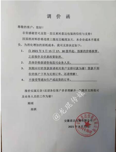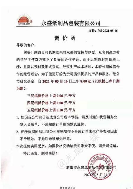 湖南龍發包裝有限公司 從2021年5月17日上午18點開始,紙板價格在現有價格基礎上上漲3%。  汕頭市萬豐紙品實業有限公司 從2021年5月15日上午8點開始,三層紙板每平方上漲0.03元/平方,四層紙板每平方上漲0.04元/平方,五層紙板每平方上漲0.05元/平方。