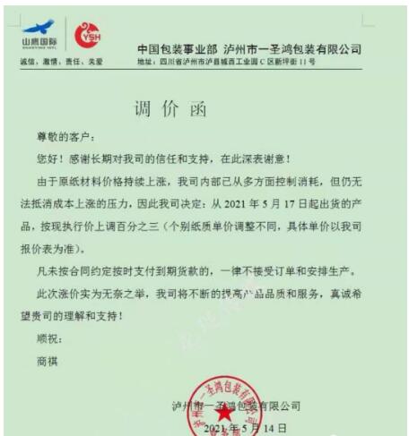 瀘州市一圣鴻包裝有限公司 從2021年5月17日起,按現執行價格上漲3%。  重慶協興包裝有限公司 從2021年5月17日起,板材現價格在執行價格基礎上上漲3%。