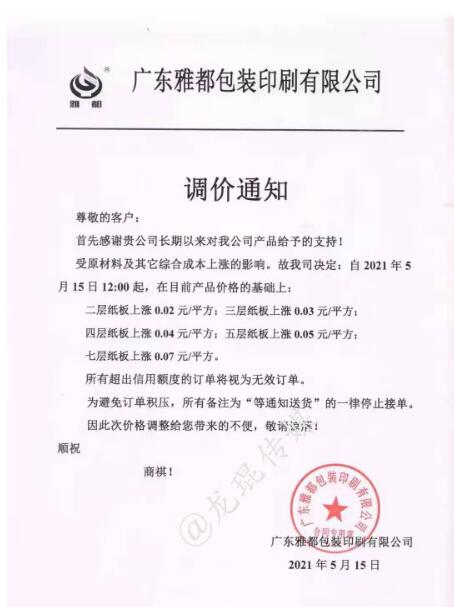 廣東雅都包裝印刷有限公司 從2021年5月15日12點起,二層紙板上漲0.02元/平方,三層紙板上漲0.03元/平方,四層紙板上漲0.04元/平方,五層紙板上漲0.05元/平方,七層紙板上漲0.07元/平方。
