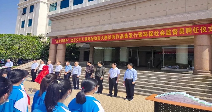 為迎接第50個世界環境日到來,6月5日上午,《共繪美好家園——“亞太森博杯”全市少年兒童環保繪畫大賽優秀作品集》發行暨環保社會監督員聘任儀式在亞太森博(山東)漿紙有限公司隆重舉行。市僑聯、市教育局、市生態環境局、日照日報社、共青團日照市委有關領導,8位受聘的環保社會監督員,90多名金海岸中學師生及公司管理層參加了儀式。