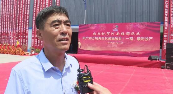 都氏集團董事長都小平:今天,我們雅都30萬噸造紙項目一期順利投產。投產以后,我們一期年產15萬噸,產值能達到7到8個億,安排就業人員200個,當年完成利稅5000萬到6000萬,為沁陽的發展再添新功。