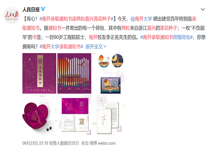 當然同樣登上熱搜榜的大學還有 南開大學 南開的錄取通知書以獨特的形式 在網上引起熱議 #南開錄取通知書送兩粒嘉興蓮花種子#▼