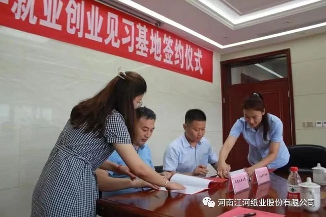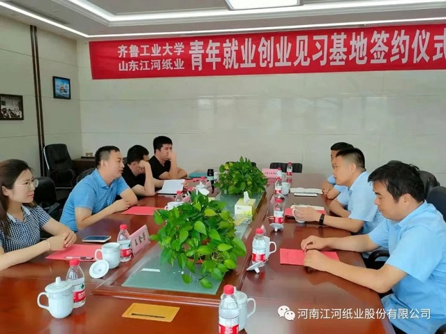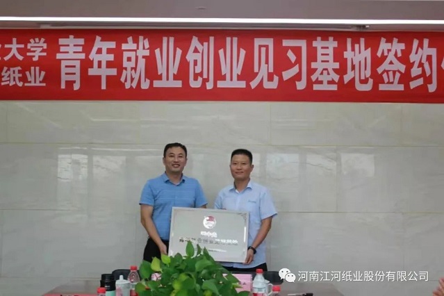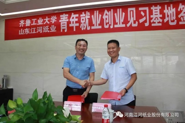 2021年7月14日,河南江河紙業(yè)股份有限公司與齊魯工業(yè)大學(xué)(山東省科學(xué)院)生物基材料與綠色造紙國(guó)家重點(diǎn)實(shí)驗(yàn)室合作共建共青團(tuán)“青年就業(yè)創(chuàng)業(yè)見習(xí)基地”及大學(xué)生社會(huì)實(shí)踐基地揭牌儀式順利舉行。因疫情防控要求,雙方在山東江河紙業(yè)舉行活動(dòng)。