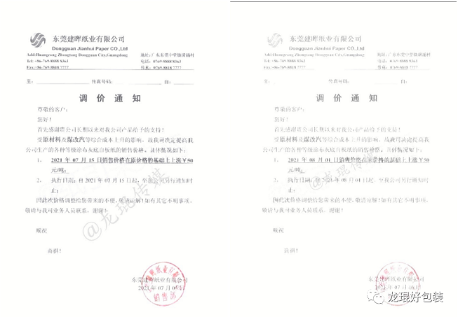 7月17日-7月20日,寧津縣寶典紙業(yè)、匯勝集團(tuán)、東莞建暉紙業(yè)、山東世紀(jì)陽光紙業(yè)等部分紙廠宣布漲價50-100元/噸。其中,東莞建暉紙業(yè)早在7月初便宣布于7月15日漲價50元/噸,在7月16日發(fā)布的漲價函中,該紙廠宣布從8月1日起再漲50元/噸。