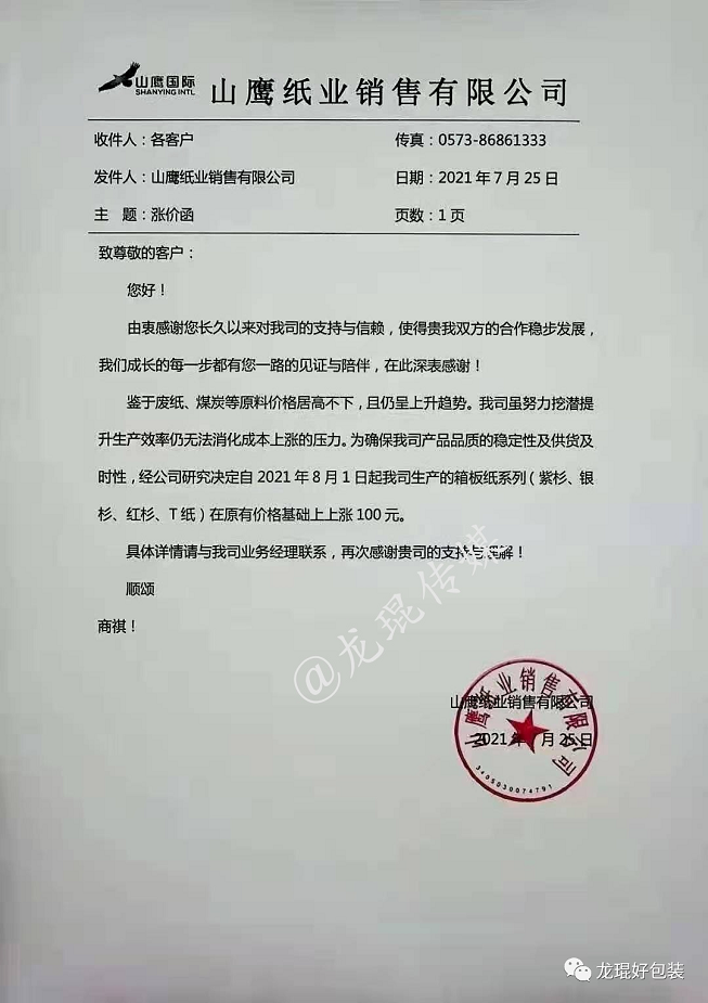 步入7月下旬后,國內(nèi)大型包裝紙廠山鷹紙業(yè)也宣布將于8月份漲價。根據(jù)山鷹紙業(yè)于7月25日發(fā)布的漲價函顯示,該公司自2021年8月1日起,生產(chǎn)的箱板紙系列(紫衫、銀杉、紅杉、T紙)將在原有價格基礎(chǔ)上上漲100元/噸。 在漲價函中,山鷹紙業(yè)稱:鑒于廢紙、煤炭等原材料價格居高不下且仍存上升趨勢,公司雖努力挖潛提升生產(chǎn)效率,但仍然無法消化成本上漲的壓力。為確保產(chǎn)品品質(zhì)的穩(wěn)定性及供貨的及時性,故從8月份開始上調(diào)原紙價格。