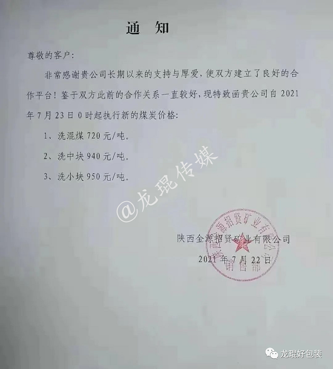 據(jù)筆者了解,國內(nèi)廢紙價格在7月中旬止跌為漲,從7月18日至今已連續(xù)上漲8天時間,遍及華東、華中、華北等地。在這幾天時間里,國內(nèi)三大包裝紙廠——玖龍紙業(yè)、理文造紙、山鷹國際,其旗下均有多個生產(chǎn)基地上調(diào)廢紙收購價30-50元/噸。 而在能源方面,由于盛夏來臨,全國各地普遍高溫,江蘇、浙江、廣東、河南等省陸續(xù)出現(xiàn)用電高峰,電廠煤炭日耗持續(xù)攀升,煤炭價格強(qiáng)勢拉升。以秦皇島港山西優(yōu)混動力煤為例,其目前平倉價為990元/噸,周環(huán)比提高10元/噸,7月以來漲幅為2.06%。 在陜西金源礦業(yè)有限公司的一份漲價函中,其煤炭產(chǎn)品自7月23日開始執(zhí)行新的價格:洗混媒720元/噸,洗中塊940元/噸,洗小塊950元/噸。該企業(yè)屬于國企控股,主要從事煤炭的開發(fā)與經(jīng)營、規(guī)劃建設(shè)礦井及選煤廠。