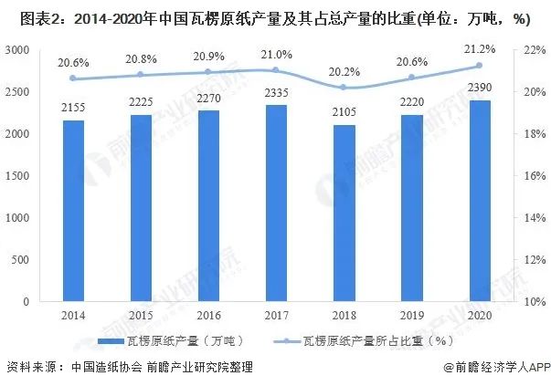 從產量規模變化情況來看,2014年以來,我國瓦楞原紙產量呈現震蕩走勢,2020年,全國瓦楞原紙產量為2390萬噸,同比增長7.67%,總產量再創新高。瓦楞原紙產量規模占所有紙及紙板產品總產量的比重維持在20%-22%之間,2020年,瓦楞原紙產量占全部紙及紙板產量的21.2%。