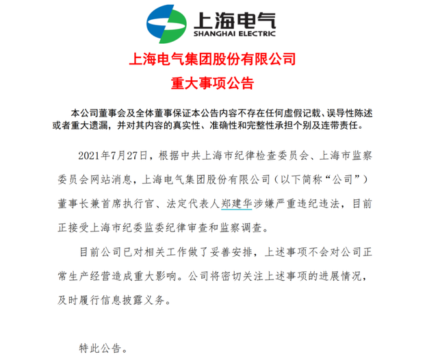 2021年7月6日,上海電氣(601727)發布公告,因公司涉嫌信息披露違法違規,中國證監會決定對公司立案調查。7月27日晚,上海電氣黨委書記、董事長鄭建華因涉嫌嚴重違紀違法,目前正接受上海市紀委監委紀律審查和監察調查。