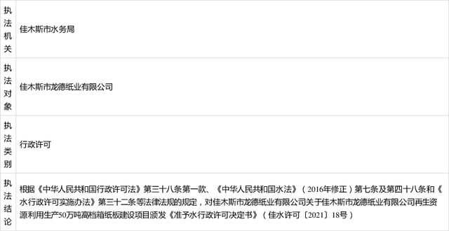 8月5日,黑龍江省佳木斯市水務(wù)局公告稱,已對佳木斯市龍德紙業(yè)有限公司再生資源利用生產(chǎn)50萬噸高檔箱紙板建設(shè)項目頒發(fā)《準予水行政許可決定書》。
