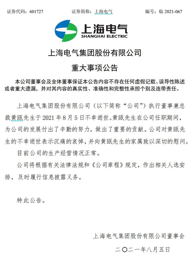 A股600億市值的上市公司,上海電氣,又出大事了。剛剛公告,50歲的執(zhí)行董事兼總裁,5日不幸逝世。 5日晚間,上海電氣發(fā)布公告稱,公司執(zhí)行董事兼總裁黃甌先生于2021年8月5日不幸逝世。黃甌先生在公司任職期間,為公司的發(fā)展付出了辛勤的努力,做出了重要的貢獻(xiàn)。公司對黃甌先生的不幸逝世表示沉痛的哀悼,并向黃甌先生的家屬致以深切的慰問。 目前公司的生產(chǎn)經(jīng)營情況正常。