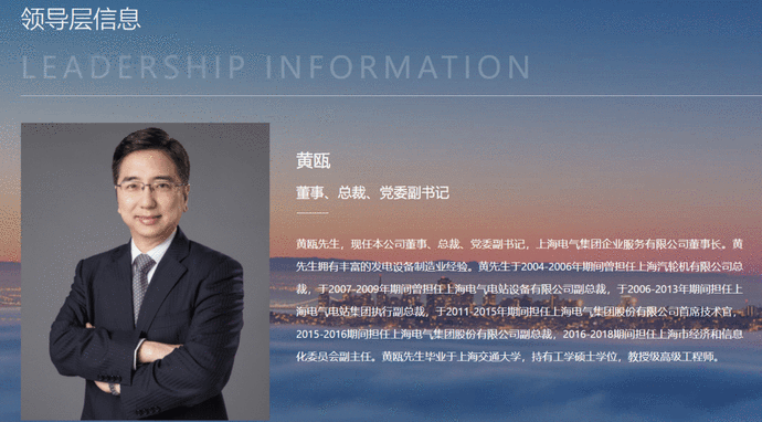 根據(jù)公開資料,黃甌今年50歲,公司董事、總裁、黨委副書記,上海電氣集團企業(yè)服務(wù)有限公司董事長(法定代表人),擁有豐富的發(fā)電設(shè)備制造業(yè)經(jīng)驗。 #黃甌生平#