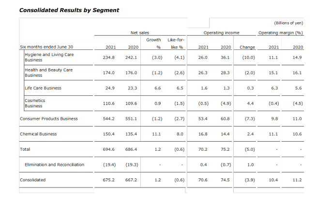 紙尿褲在華收入下跌或達15億 衛(wèi)生巾銷量增長強勁 花王集團可報告部分可分為五項基礎業(yè)務:由四個業(yè)務領域(衛(wèi)生與生活護理業(yè)務、健康與美容護理業(yè)務、生物護理業(yè)務、化妝品業(yè)務)構成的消費品業(yè)務和化學業(yè)務。 其中,衛(wèi)生和生活護理業(yè)務涵蓋衛(wèi)生用品、家庭護理產(chǎn)品以及織物護理產(chǎn)品,2021年上半年凈銷售額為2348億日元(約138億人民幣),較去年同期減少3%。在衛(wèi)生用品方面,妙而舒嬰兒紙尿褲在印度尼西亞的銷量穩(wěn)定,但在中國有所下降,營業(yè)收入同比減少100億日元-260億日元(約5.9-15億人民幣)。樂而雅衛(wèi)生巾在中國的銷量增長強勁,但由于缺乏特殊需求等因素,在日本的銷量有所下降。 在2021年1月至6月期間,日本的家庭和個人護理產(chǎn)品市場(花王集團的主要市場)與上年同期相比出現(xiàn)萎縮,這反映出市場需求(主要是衛(wèi)生相關產(chǎn)品)沒有增加,該需求在上一年因大流行而出現(xiàn),但與前兩年同期相比有所增長。 按照部門劃分,其他業(yè)務部門業(yè)績也略顯頹勢。健康和美容護理業(yè)務凈銷額為1740億日元,同比下降1.2%;生物護理業(yè)務凈銷額為249億日元,同比上漲6.6%;化妝品業(yè)務凈銷額為1106億日元,同比上漲0.9%,然而據(jù)財報顯示,化妝品市場萎縮嚴重,緊急狀態(tài)在各地區(qū)持續(xù)。總體來看,消費品業(yè)務凈銷額為5442億日元,同比下降1.2%。 另一方面化學業(yè)務迎來增長,凈銷額為1504億日元,同比上漲11.1%。隨著汽車相關、石油衍生品及其他領域需求的復蘇,花王集團穩(wěn)步受益。