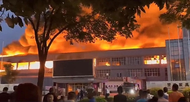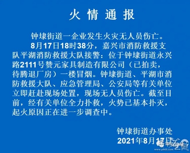8月17日晚18:38,浙江嘉興平湖市開發區一家工廠突發大火,火勢兇猛,當地出動165名消防員趕往撲救,晚上10點大火基本撲滅,所幸無人員傷亡。