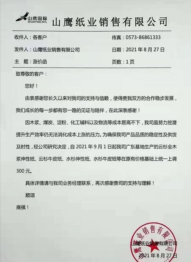 持續(xù)一周的東莞玖龍?jiān)垉r(jià)格優(yōu)惠100元/噸截止昨天結(jié)束,今日瓦楞紙及箱板紙市場漲跌互現(xiàn)。廣東、福建地區(qū)龍頭企業(yè)上調(diào)瓦楞紙及箱板紙價(jià)格50元/噸,部分恢復(fù)上月底的優(yōu)惠,當(dāng)?shù)夭糠种行〖埰蟾鷿q50元/噸,受提價(jià)刺激出貨略有好轉(zhuǎn)。沈陽玖龍今日起執(zhí)行50-100元/噸的優(yōu)惠政策,執(zhí)行到本月7日。 近兩天白板紙市場大部維穩(wěn),局部上調(diào)。繼玖龍?zhí)旖颉⒅貞c基地上調(diào)白板紙出廠價(jià)格50元/噸后,今日東莞紙企上調(diào)白板紙出廠價(jià)格50元/噸,福建地區(qū)紙企上調(diào)個(gè)別產(chǎn)品價(jià)格50元/噸,周邊部分紙企意向上調(diào)白板紙出廠價(jià)格50元/噸。 原紙市場:東莞玖龍紙價(jià)優(yōu)惠全部取消,山鷹上調(diào)300 9月1日起東莞玖龍紙業(yè)的價(jià)格政策逐步調(diào)整,分批分次取消原先的價(jià)格優(yōu)惠:(1)9月1日瓦紙、牛卡、再生牛卡上調(diào)50元/噸;(2)9月8日瓦紙、牛卡、再生牛卡上調(diào)50元/噸。 8月27日,山鷹紙業(yè)發(fā)布漲價(jià)函,因木漿、煤炭、淀粉、化工輔料以及物流等成本上漲的壓力,自2021年9月1日起,我司廣東基地生產(chǎn)的云杉全木漿伸性紙、云杉牛皮紙、水杉伸性紙、水杉牛皮紙等在原油價(jià)格基礎(chǔ)上統(tǒng)一上調(diào)300元。  廢黃板紙市場止跌企穩(wěn),價(jià)格漲跌不一 【華東地區(qū)】 9月1日福建漳州華南山鷹基地廢紙調(diào)價(jià)信息 9月1日起華南山鷹紙業(yè)價(jià)格A、B、邊角料上調(diào)30,其他價(jià)格不變,執(zhí)行:a級2530,B級2480,包裝廠下腳料2480,C級2250,D級2220,E級2050,紡線管(大管)1920,紡線管(長小管)1870. 9月1日安徽宿州鑫光廢紙調(diào)價(jià)信息 9月1日起安徽鑫光紙業(yè)廢紙上調(diào)30,執(zhí)行:A-級2600;B級2580;C級2540;D級2480;E級2370 9月1日江蘇淮安恒潤廢紙調(diào)價(jià)信息 9月1日起江蘇淮安恒潤紙業(yè)黃板價(jià)格上調(diào)30,執(zhí)行:A2230,B2180,C2130,D2080 【華中地區(qū)】 9月1日湖南衡山新金龍紙業(yè)廢紙調(diào)價(jià)信息 9月1日起衡山新金龍廢紙價(jià)格下調(diào)30,執(zhí)行:A-級2530,B級(含啤酒箱)2490,C級2440, 9月1日湖北松滋榮成廢紙調(diào)價(jià)信息 9月1日起湖北榮成紙業(yè)下調(diào)20,調(diào)后:A-級2580,C級2520 9月1日湖南瀏陽大瑤天和紙業(yè)廢紙調(diào)價(jià)信息 9月1日起瀏陽市天和紙業(yè),黃廢下調(diào)20,白廢類:單頁2300,一級撕皮(去膠)書2250,二級撕皮(去膠)書2200,統(tǒng)書2030,散書紙低50,高欄車散書低70,黃板類:A-級包(純黃)2490,B級包(80%)2410,C級包(70%)2310,散裝全黃瓦楞箱2360,所有黃廢類小包低30 【華南地區(qū)】 9月1日廣東東莞建航廢紙調(diào)價(jià)信息 9月1日起東莞建航紙業(yè)廢紙價(jià)格上調(diào)30,執(zhí)行:特級2630,一級2430,二級2330,雜質(zhì)含量高的(超3%)不收 【華北地區(qū)】 9月1日山西大同冠森紙業(yè)調(diào)價(jià)信息 9月1日起山西大同冠森紙業(yè)價(jià)格下調(diào),執(zhí)行:AA級2340,A級(黃板85%-95%)2290(1個(gè)點(diǎn)起),B級(黃板60%-80%)(3個(gè)點(diǎn)起)2160-2260,C級(黃板30%以上)2060(7個(gè)點(diǎn)起).質(zhì)量要求:貨干,水分12%以內(nèi),手工分揀干凈,不夾帶垃圾雜質(zhì),超出據(jù)實(shí)扣罰。特別注明:嚴(yán)禁打水摻假和夾帶潮包,杜絕一切易燃易爆物品,一經(jīng)發(fā)現(xiàn)加重扣點(diǎn)!(省外300公里以上補(bǔ)助運(yùn)費(fèi)30元/噸) 【西南地區(qū)】 9月1日云南建水春秋紙業(yè)廢紙調(diào)價(jià)信息 9月1日起云南建水春秋紙業(yè)廢紙價(jià)格上調(diào)50,執(zhí)行:特級2450,黃板2350、混合2250。 9月1日玖龍紙業(yè)武侯市場中轉(zhuǎn)A庫調(diào)價(jià)信息 9月1日10點(diǎn)起玖龍紙業(yè)武侯市場中轉(zhuǎn)A庫價(jià)格調(diào)整,執(zhí)行:綜合紙,黃板含量70%1770-1840,超市紙,黃板含量85%1840-1940,社會廠紙/純工廠紙,黃板含量100%,2070-2200,小統(tǒng)貨黃板20-30%,1670-1770;書本廢紙1650-1700;廣告紙1400-1450 廢黃板紙市場止跌企穩(wěn),瓦楞紙及箱板紙成本無太大變化。上半年各企業(yè)年報(bào)逐步公布,行業(yè)各環(huán)節(jié)也出現(xiàn)喜憂參半狀況。金九銀十的關(guān)鍵節(jié)點(diǎn),受需求增長不明確影響行業(yè)整體走勢沉悶,中下游持續(xù)觀望情緒嚴(yán)重。 預(yù)計(jì),華南地區(qū)龍頭企業(yè)上調(diào)紙價(jià)提振部分市場信心,然終端需求疲軟,市場觀望氛圍濃厚,經(jīng)銷商出貨放緩,訂單乏量,市場交投信心整體不足,短期內(nèi)成品紙價(jià)格或以穩(wěn)中窄幅震蕩為主。 回顧市場,疫情的再次復(fù)發(fā)也為八月紙價(jià)走勢帶來波動。七月疫情在南京再度復(fù)發(fā),隨后疫情外溢至少全國24地,此次疫情源頭為德爾塔毒株,傳播速度快,感染性更強(qiáng),且此前研發(fā)的疫苗對之鮮有成效。 這次疫情復(fù)發(fā)對全國防疫系統(tǒng)將是一場嚴(yán)峻挑戰(zhàn),同時(shí),也為紙包行業(yè)帶來重大影響。一方面,疫情復(fù)發(fā)將導(dǎo)致紙包行業(yè)生產(chǎn)、運(yùn)輸?shù)瘸杀镜纳仙涣硪环矫妫咔閺?fù)發(fā)可能影響消費(fèi)市場,從而影響到紙包行業(yè)的終端需求。