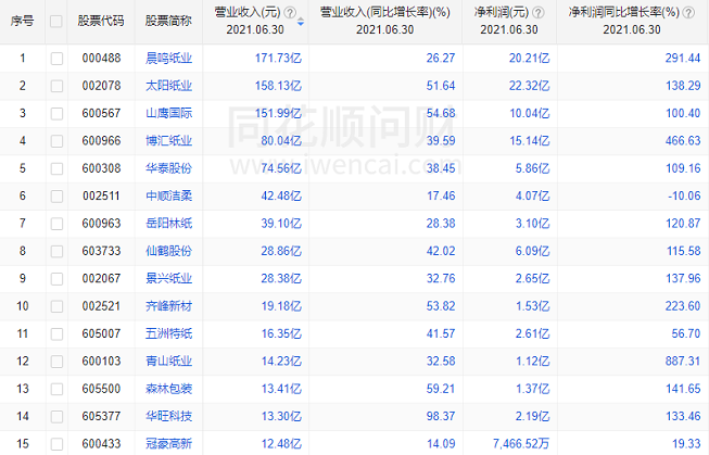 在盈利增速方面,21家凈利潤實現正增長,其中凈利潤同比增長超過100%的有14家,青山紙業增幅最大,同比上升887.31%。  一些結論 造紙行業景氣度回升利好企業 造紙關乎國計民生,與宏觀經濟環境關系密切。造紙企業們交出了滿意的答卷,很大程度上得益于行業景氣度整體復蘇的大背景。2021年上半年,隨著國內疫情得到控制,宏觀經濟環境全面復蘇,紙制品作為基本的生產和生活資料的需求也被逐步釋放。據工業和信息化部公布的數據,2021年1-6月,全國造紙及紙制品營業收入7142億元,同比增長24.7%;利潤總額484.3億元,同比增長77.2%。 做大做強產業鏈是發展趨勢 疫情導致上游原料價格增長,行業總體成本提升,這對造紙行業來說都是一個重大考驗。但對于擁有完整產業鏈的企業而言,其成本優勢更容易凸顯。 晨鳴紙業早在二十年前就布局了產業鏈一體化戰略,基于公司430萬噸自制漿的原料成本優勢以及水運、陸運的配套運輸優勢,有效管控成本以確保自身競爭力,例如晨鳴紙業自制木漿成本較一般市場價格要低數百元,總體運輸成本也優于同業;圍繞造紙產業鏈,太陽紙業也進行了多元化布局,目前已經構建起了山東、廣西和老撾三大基地,隨著今年下半年廣西基地紙、漿項目陸續投產,太陽紙業漿、紙產能將超過1000萬噸;而博匯被APP(中國)收購之后,能夠享受到集團林漿紙一體化布局帶來的成本優勢,有效提升紙漿成本優勢和盈利能力。 革新技術和產品方贏先機 從各家紙企的布局看,對于產品和技術的持續革新也為增強公司競爭力貢獻一筆。博匯紙業在上半年緊抓“以白代灰”、“以紙代塑”的政策變化帶來的先機,加大新產品研發和升級,成功開發出高檔食品卡、紙杯原紙、涂布紙杯紙等新產品,同時還開發出防偽煙包、特種銅版卡、高級名片紙、白面牛卡、吸塑紙等新產品滿足特殊客戶差異化需求;晨鳴集團則加快新舊動能轉換步伐,改造升級高端產能,高檔產品比重占到95%以上;太陽紙業為實現產品差異化競爭,正適時調整經營策略,目前在研發方面已構建了較為完善的科技創新體系,并擁有一支專業、高效、技術過硬的科技研發隊伍,公司每年的研發投入占比處于同行前列。 這一輪業績公布,有人喜,卻也有人憂。憂的是,利潤都是別人的。 如上文提到的,無論是深耕產業鏈,還是革新產品和技術,都需要企業有充足的資金流能持續投入,也就是說,非頭部企業而難為?梢韵胍姡诃h保趨嚴、成本上漲的態勢下,缺少話語權的中小企業所面臨的生存壓力將越來越大。而中下游的包裝廠印刷廠尤其深受其困,根據紙箱說反映,“中游板箱企業盡管營業額增幅較大、但是利潤率增長不高”。“上游亂漲價,下游苦哈哈”,更是許多人心境的寫照。 在金九銀十的傳統需求旺季到來之際,目前卻趨勢不明,前途難料,整個市場觀望氛圍濃厚。